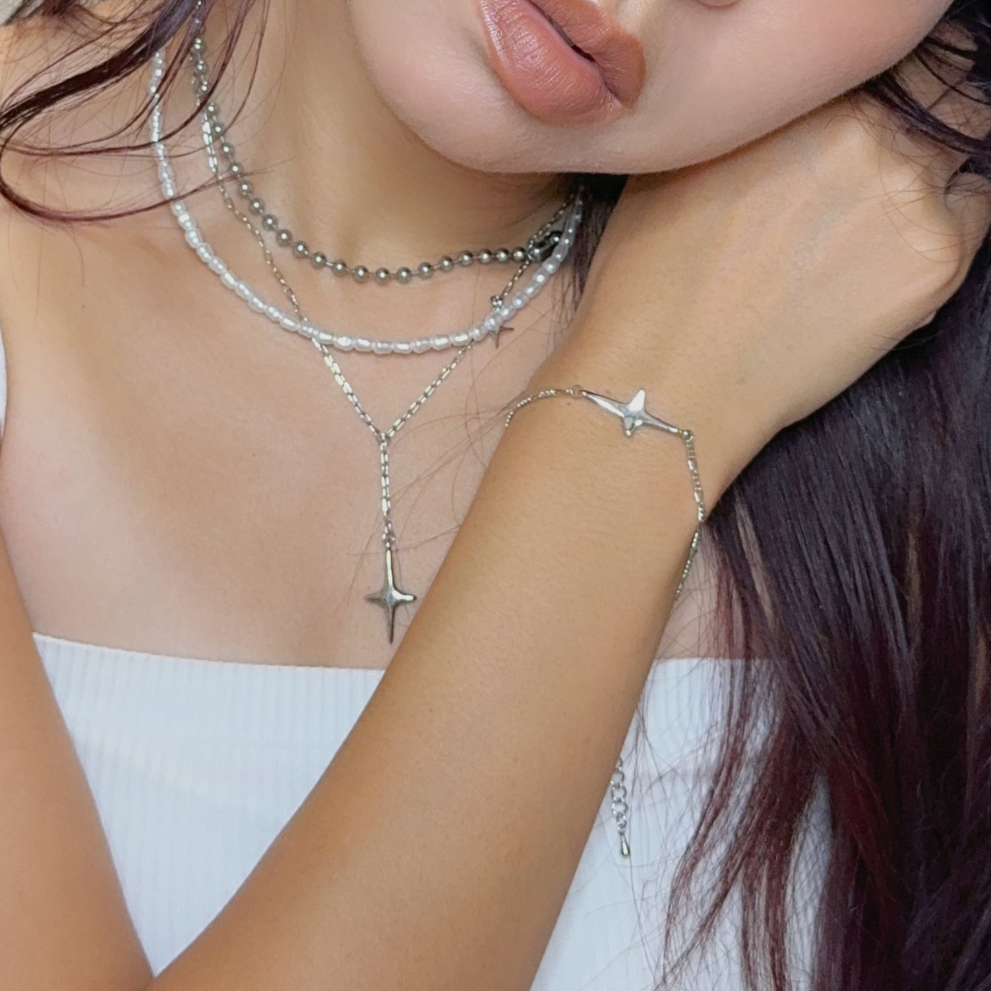 小さいパールだからこそ、華やかになりすぎず、カジュアルにも綺麗目のスタイリングにも幅広く大活躍。
